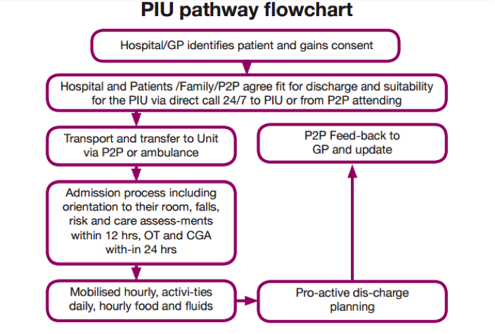 The average length of stay on the Promoting Independence Unit (PIU) is 9.1 days, during this time the team undertake treatments usually done in hospital e.g. intravenous antibiotics etc, ensure that muscle strength that has been lost in hospital is improved (reducing the chance of falls), nutrition and hydration are improved and enhanced (improving recovery and reducing susceptibility to infection). The PIU team ensure that therapy is continued, adherence to medication is encouraged and monitored and that any social needs required for the home setting are assessed and arranged; this includes end of life care and support. The team continues to provide support via outreach and telecare and a crisis line until they decide they and family do not need further support.
